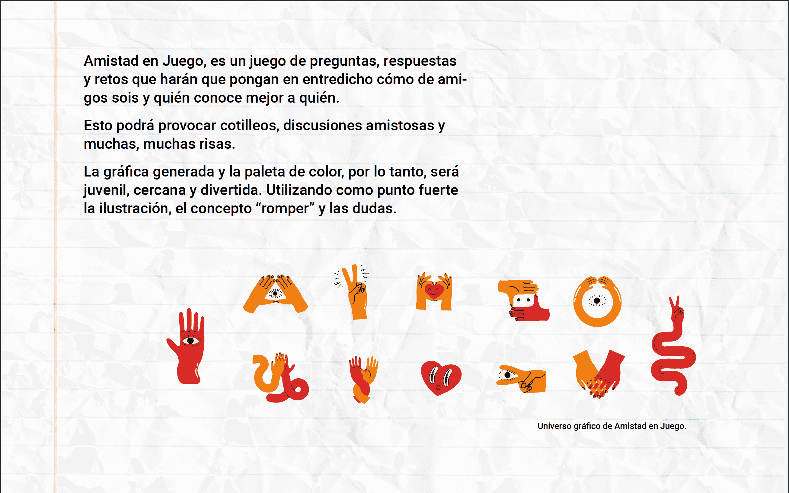 Con el reto dado: Crea un diseño atractivo y visualmente cautivador para un nuevo juego de fiesta que gire en torno al tema: «¿Quién de tu grupo de amigos conoce mejor a todo el mundo?». El objetivo es desencadenar una competición divertida y desenfadada entre los jugadores mientras compiten por el título definitivo de «Mejor Amigo». Se ha desarrollado Amistad en juego, «Amistad en Juego» es un juego dinámico de preguntas, respuestas y retos diseñado para comprobar hasta qué punto los amigos se conocen de verdad. El objetivo es suscitar debates divertidos, provocar cotilleos y generar risas sin fin, todo ello mientras se revela quién conoce mejor a sus amigos.