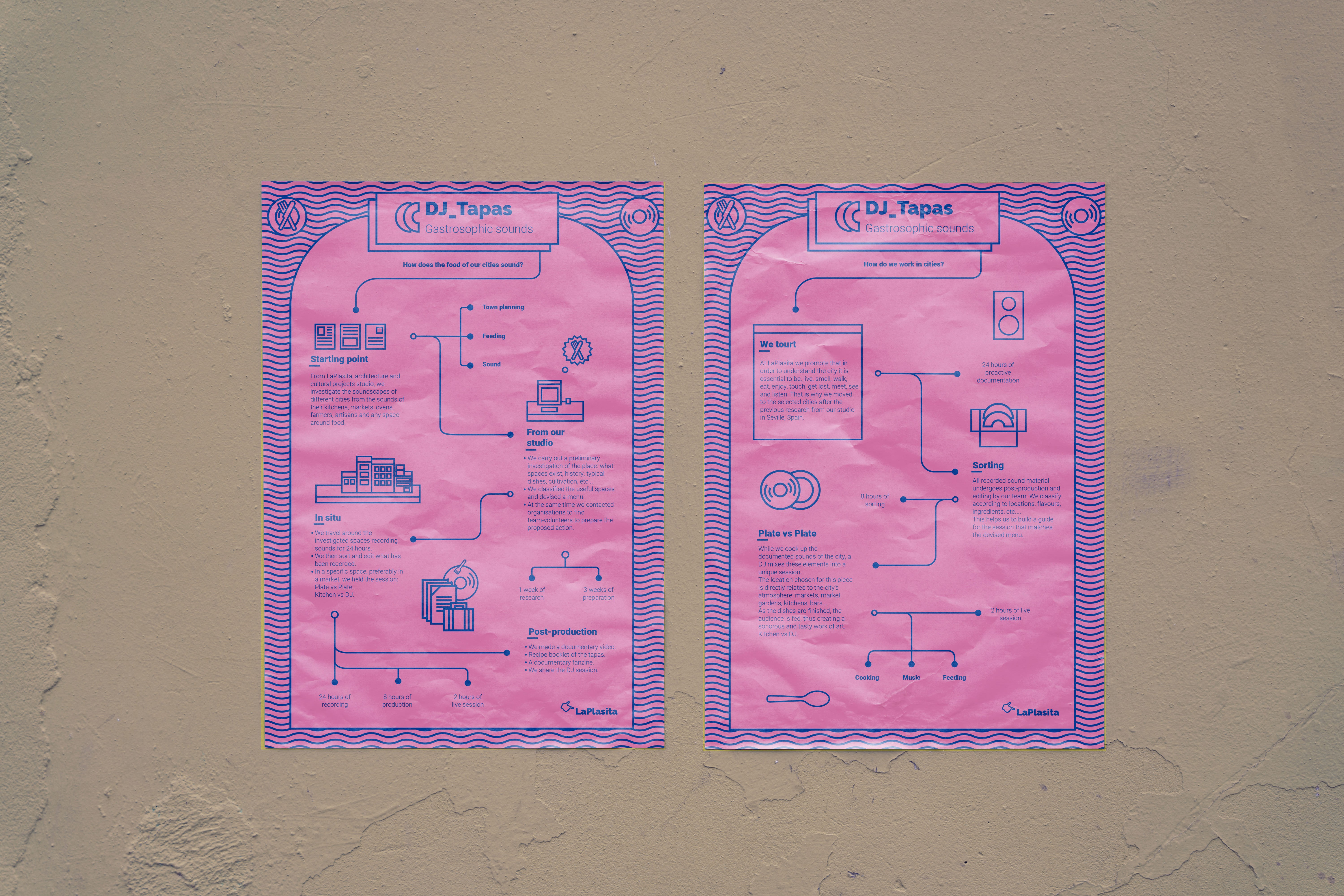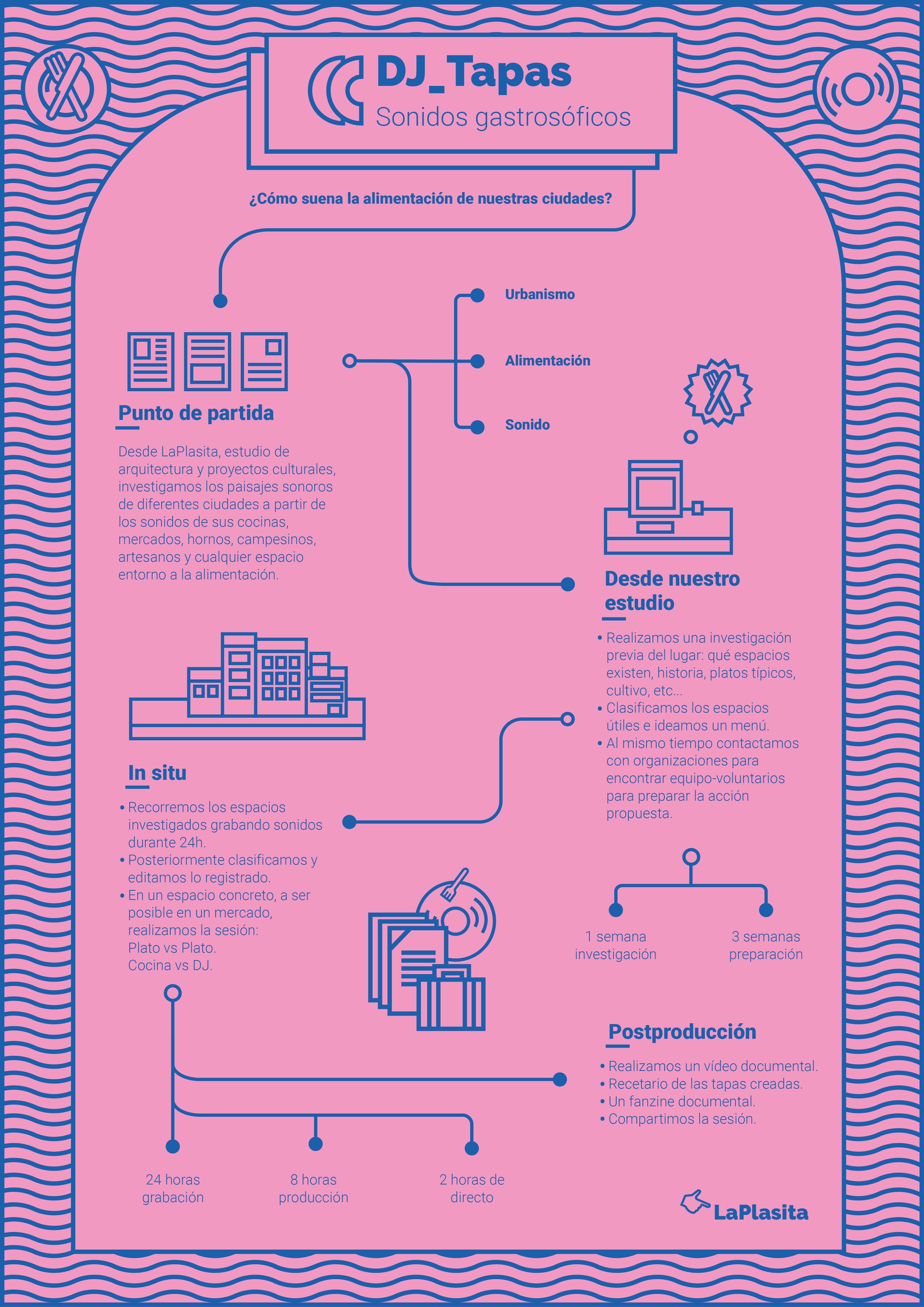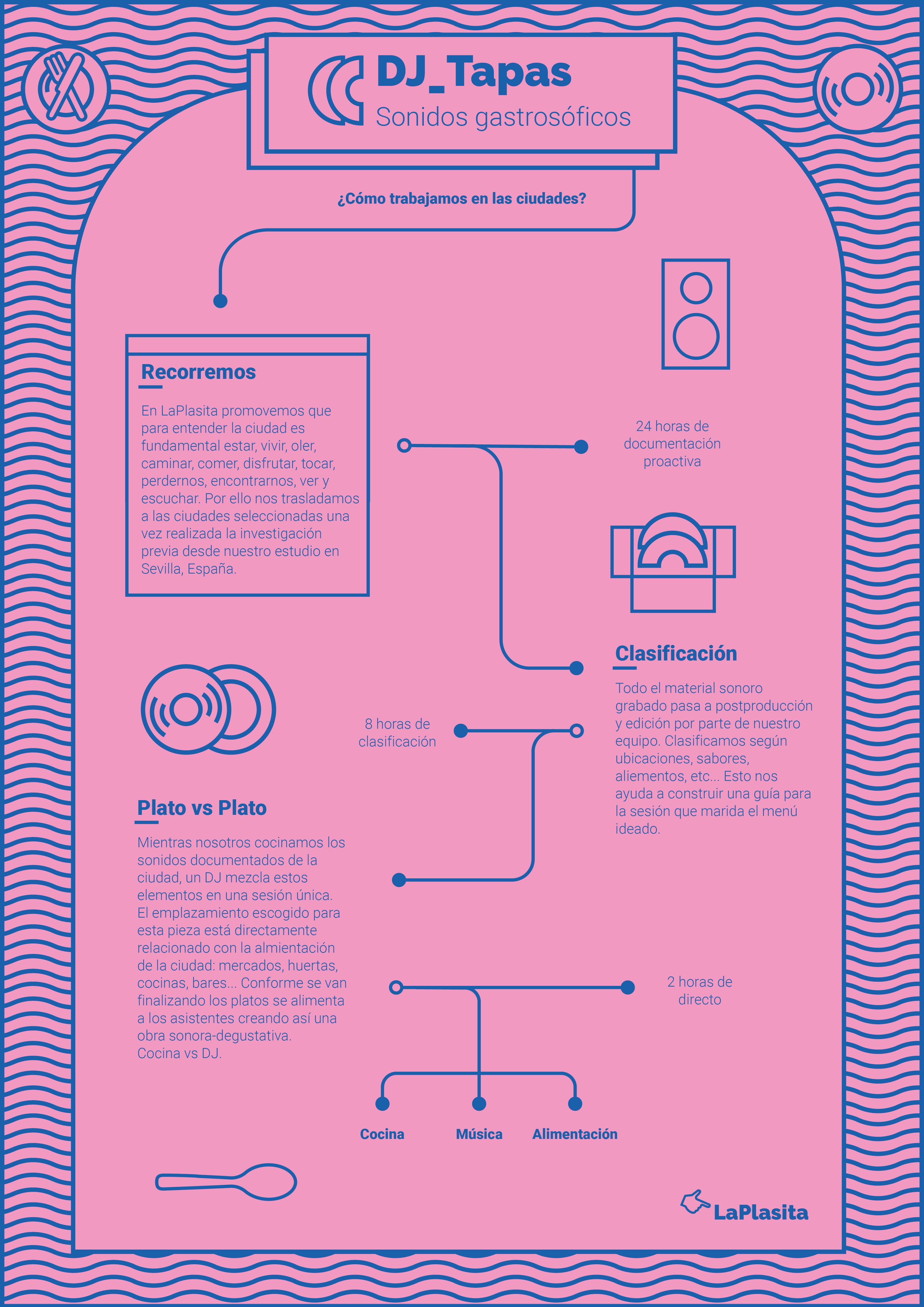DJ Tapas es un proyecto del estudio sevillano LaPlasita, que se ocupa mediante esta performance de estudiar cómo son los sonidos de la alimentación, desde su cultivo hasta su fase final en reciclaje pasando por su cocina o ingesta. Todo ello ha quedado recogido en una serie de live seasons maridado con diversas tapas de cada ciudad. Plato vs Plato.